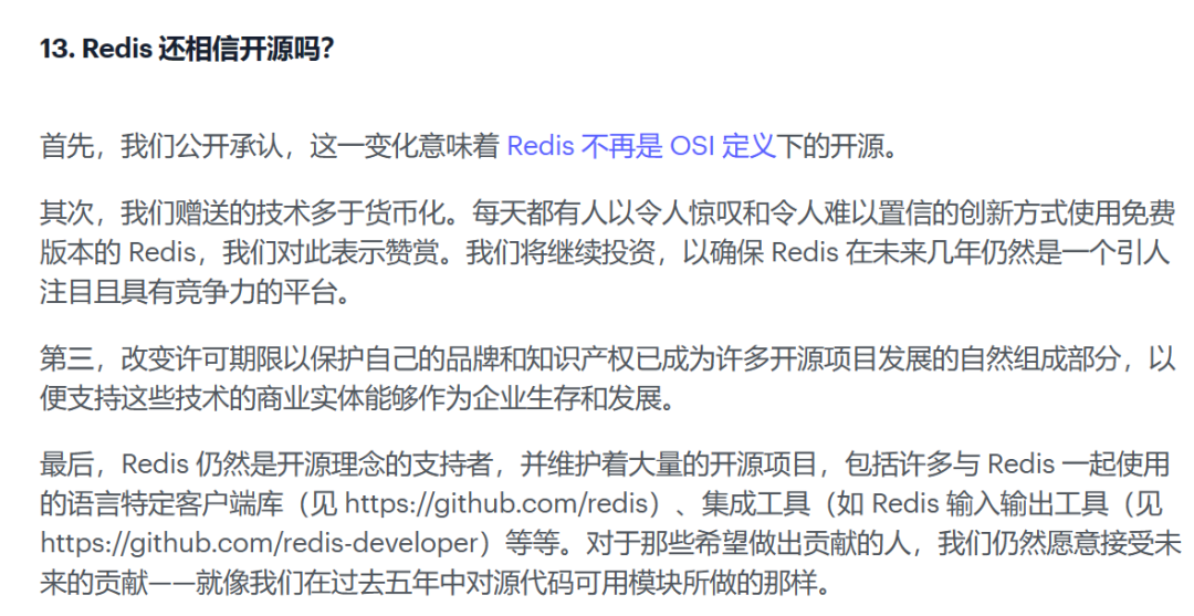 1.“对于使用 Redis 开源版本的 Redis 和使用双许可证供其内部或个人使用的新版本的最终用户,没有变化。”
