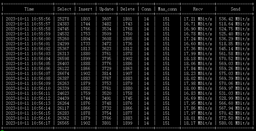 复制MySQL命令行监控工具 - mysqlstat options: -h, --help show this help message and exit -H MYSQL_IP, --mysql_ip MYSQL_IP Mysql IP -P MYSQL_PORT, --mysql_port MYSQL_PORT Mysql Port -u MYSQL_USER, --mysql_user MYSQL_USER Mysql User -p MYSQL_PASSWORD, --mysql_password MYSQL_PASSWORD Mysql Password --top TOP 需要提供一个整数类型的参数值,该参数值表示执行次数最频繁的前N条SQL语句 --io IO 需要提供一个整数类型的参数值,该参数值表示访问次数最频繁的前N张表文件ibd --lock 查看当前锁阻塞的SQL --dead 查看死锁信息 --index 查看重复或冗余的索引 --conn 查看应用端IP连接数总和 --tinfo 统计库里每个表的大小 --binlog Binlog分析-高峰期排查哪些表TPS比较高 --repl 查看主从复制信息 -v, --version show programs version number and exit1.2.3.4.5.6.7.8.9.10.11.12.13.14.15.16.17.18.19.20.21.22.23. 实时监控mysql服务器的QPS、TPS、网络带宽指标(默认不加参数选项) 复制shell> chmod 755 mysqlstat shell> ./mysqlstat -H 192.168.198.239 -P 6666 -u admin -p hechunyang1.2.3.4.