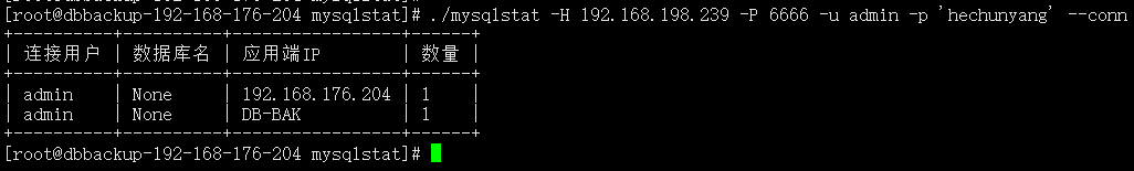复制shell> ./mysqlstat -H 192.168.198.239 -P 6666 -u admin -p hechunyang --binlog mysql-bin.000003 mysql-bin.0000061.2.会统计mysql-bin.000003,mysql-bin.000004,mysql-bin.000005,mysql-bin.000006这4个文件