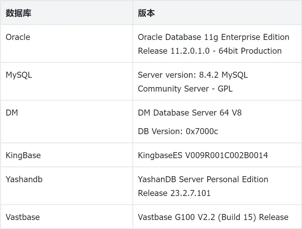 国内数据库厂商及产品非常多,选择哪些厂商及产品是个很头疼的事情。这里本着主流或有代表性的原则进行选择。从现有集中式数据库的市场占有率方面,选择头部的厂商达梦、电科金仓为代表。从生态方面选择 openGauss 生态的海量数据;MySQL生态上没有太好选择,故使用最新社区版本;PG 生态上由之前的电科金仓来代表。自研方面,免费源码下载则采用的崖山数据库,毕竟其主打也是Oracle的兼容能力。最后也选择 Oracle 在国内仍然大规模使用的版本作为参照对象。