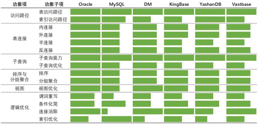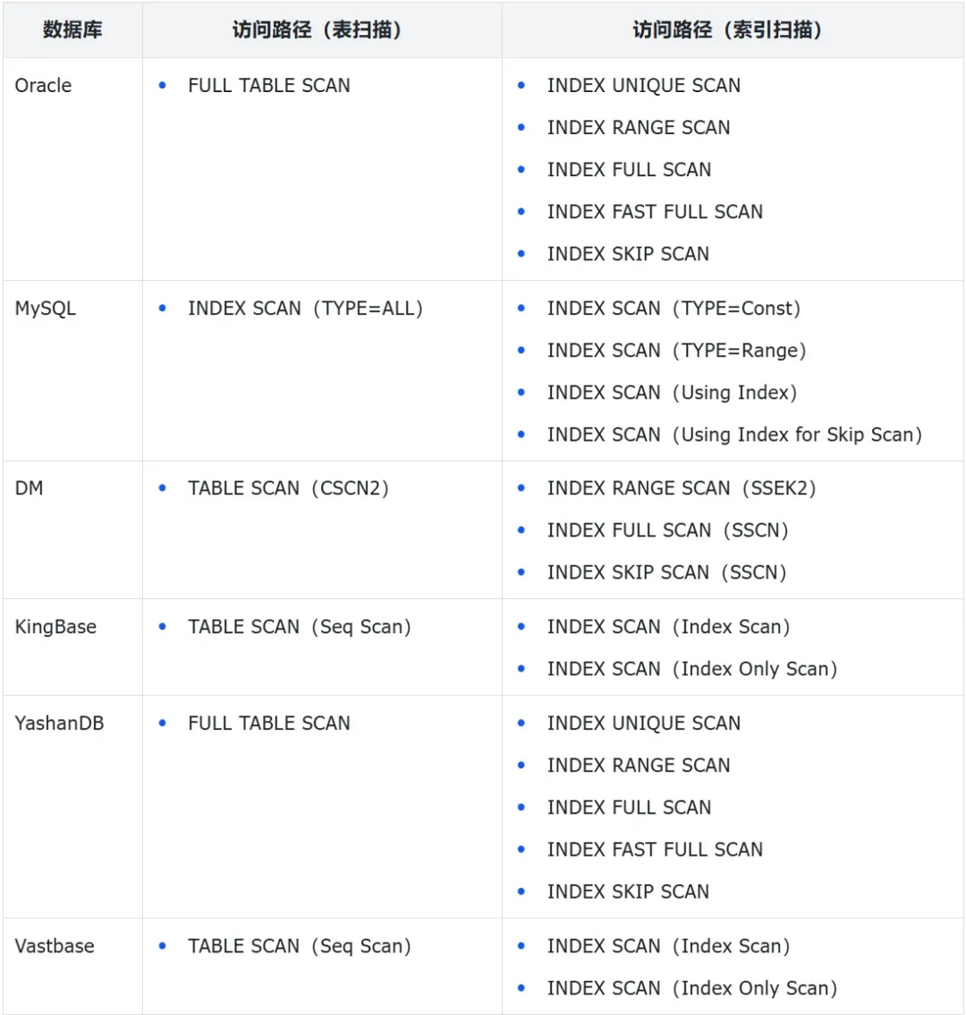 (1)访问路径访问路径,主要看数据库通过表或索引访问数据时,支持的访问方式。更多、更丰富的访问方式,代表可能采取更为高效的方式来访问数据。针对这方面,国产数据库表现差异较大,特别是针对索引的访问方式。