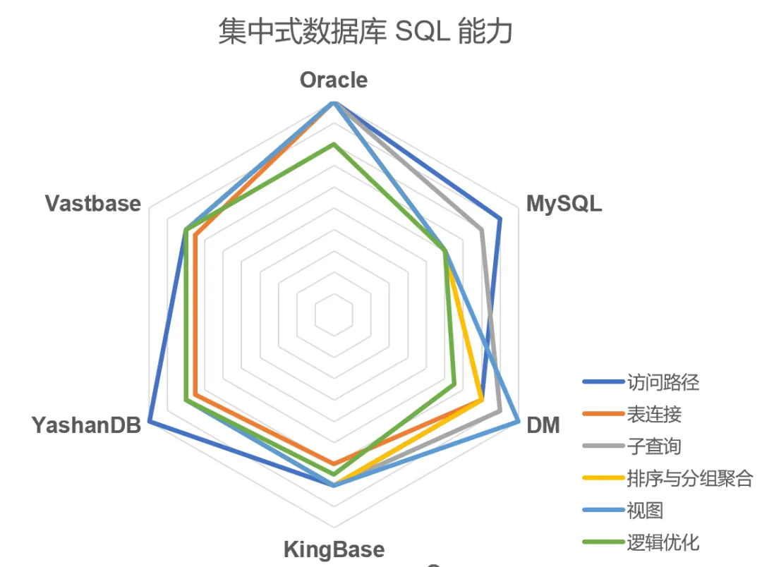 从上述这个表格里,可对各个数据库对SQL支持能力有个全面的了解。为更清晰的表现出数据库的综合能力,我通过下面的雷达图更为清晰地表达下。
