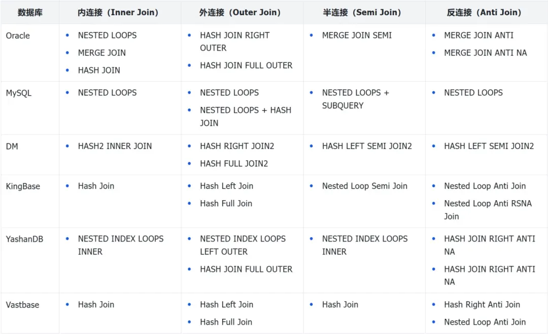 针对表连接的情况,主要是看数据库采用何种执行计划来完成。在在同样架构、同等数据规模,都收集统计信息的情况下,不同数据库在选择嵌套循环、排序合并还是哈希关联上,效率还是差异挺大的。针对这方面,国产数据库表现差异不大,针对三种关联方式大多支持,但在具体的选择使用上,还是存在不同。