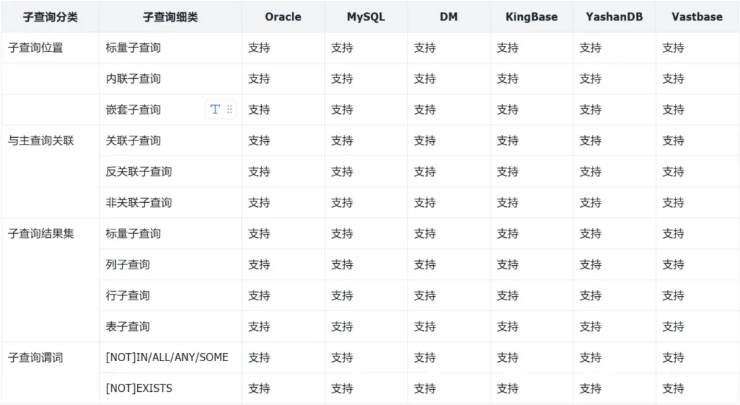 子查询根据其所处位置、与主查询关系、结果集形式及含有谓词情况,分为多种类型。考察一个要点,就是数据库对上述子查询不同种类的支持情况。针对这方面,国产数据库都已支持。