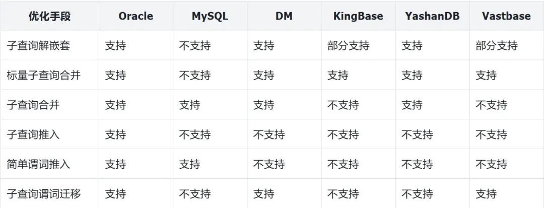 子查询有多种优化方式,包括子查询展开、子查询合并、子查询推入、谓词迁移等。其核心目的:一是尽量不使用子查询,将其与外侧查询一起处理,这样更优;二是如果不能展开,则将更多的条件能放入子查询内执行,尽早减少数据规模,达到优化目的。针对这方面,国产数据库表现尚待提高,针对包含多层嵌套的子查询,表现较Oracle差距还是很大。