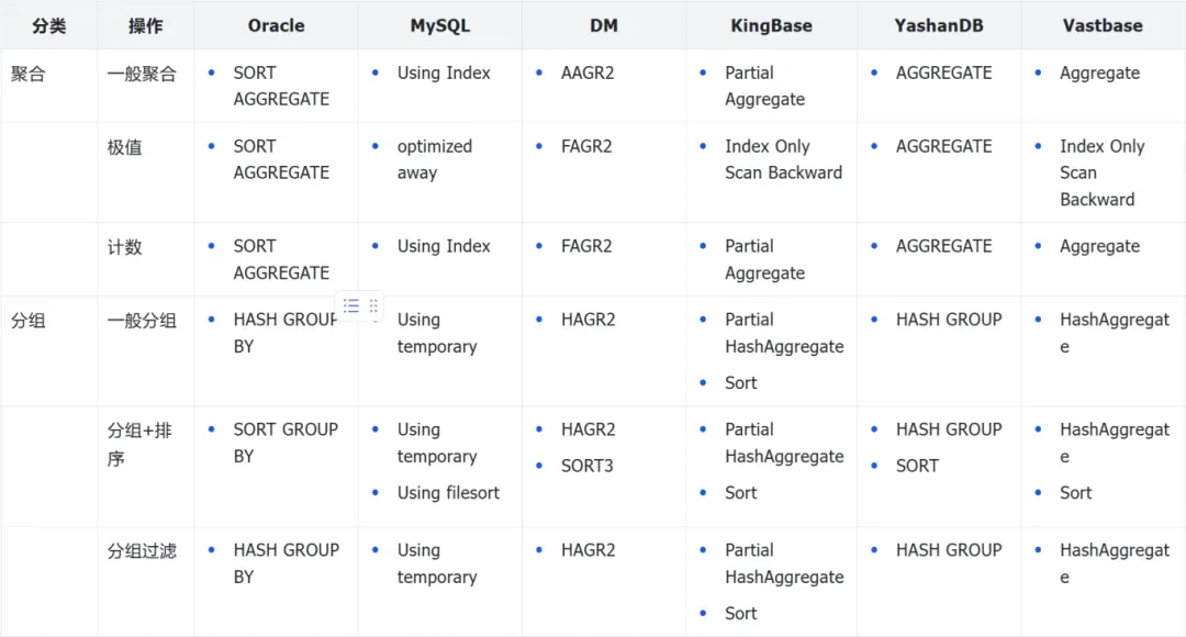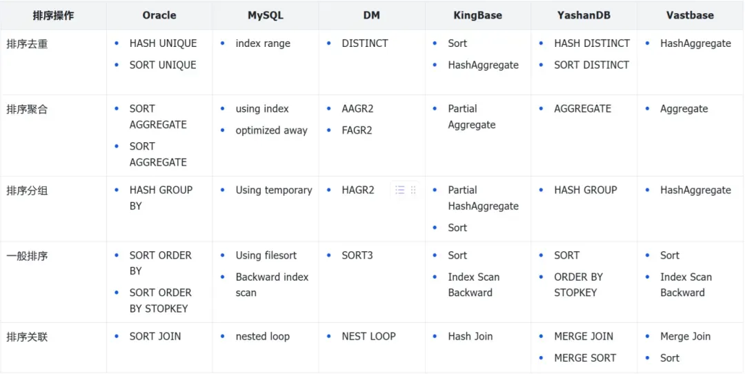 排序,是数据库内比较消耗资源的一类操作,特别是在结果比较大的情况下。因此在数据库处理上,应尽量规避排序的行为。在上面这些操作中,有些是为了进行排序,有些是为了其他目的(如去重等);因此数据库是可以考虑优化此类排序行为的。例如Oracle数据库,在10g以前的版本是通过SORT GROUP BY完成分组的,但在10g之后默认提供了HASH GROUP BY,这样效率更高,当然其结果集不保证有序了。针对这方面,国产数据库表现差异较大,针对不同排序需求,所能采取的优化手段在选择上存在差异。