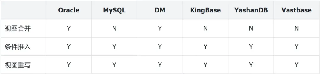 视图优化,是指针对语句中存在视图的情况采取的优化手段,包括有视图合并、条件推入、视图重写等情况。视图合并,是指对于存在复杂视图的查询,优化器可以有两种方式来优化查询。一是创建一个用于聚集视图合并结果集,并把这个结果集连接到基表中;另一个是展开视图连接两个基表并聚集这些连接。条件推入,则是指在无法执行视图合并的情况下,将读取查询中的查询条件推入到视图查询中去。视图重写,则是将对视图的引用重写为对基本表的引用。视图重写后的SQL多被子查询进行进一步优化。针对这方面,国产数据库表现差异不大,针对视图合并类的优化还有较大差距。