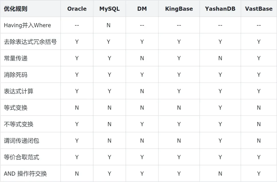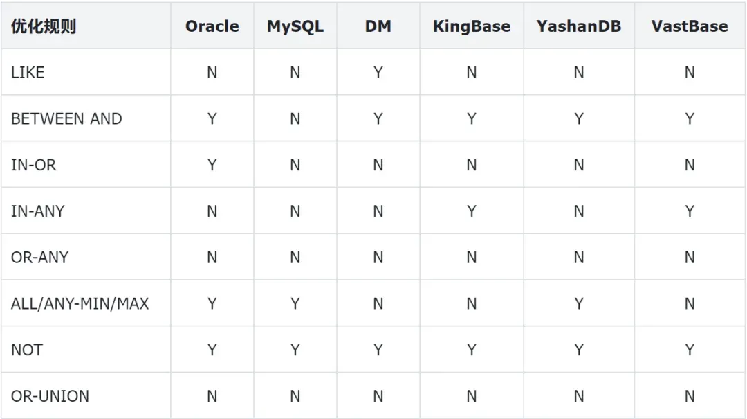 谓词重写,又称为等价谓词重写,是指将原执行效率低的谓词改写为效率高的谓词并重写SQL,从而提高SQL的整体执行效率的一种优化手段。其本质是在于不同谓词的处理效率存在差异所导致。针对这方面,国产数据库表现参差不齐,主要看内部处理效率,改写倒不一定效率就很高。