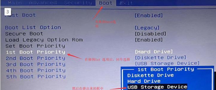 在电脑启动时按下对应的按键进入BIOS设置界面,调整启动顺序,将U盘设置为第一启动项。