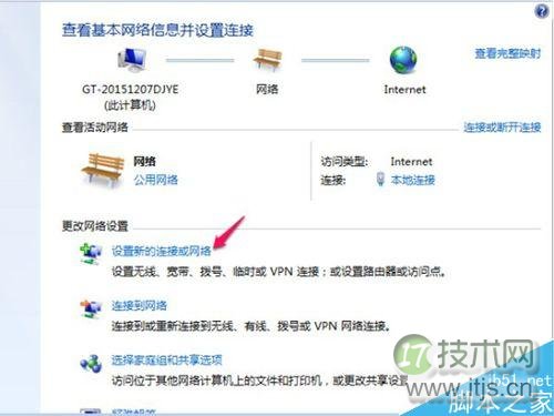 6、在"网络和共享中心"窗口的宽带下边,可以找到"设置新的连接或网络",点击进入其中.