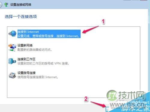 7、在新弹出的连接"设置连接和网络"窗口下,里面有"连接到Internet,设置无线,宽带或拨号连接,连接到Internet"这个选项,单击它,然后再点击”下一步”