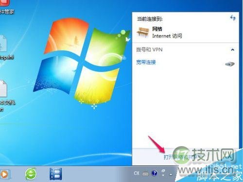 在弹出新窗口后,在窗口的最下方,点击进入"打开网络和共享中心"选项