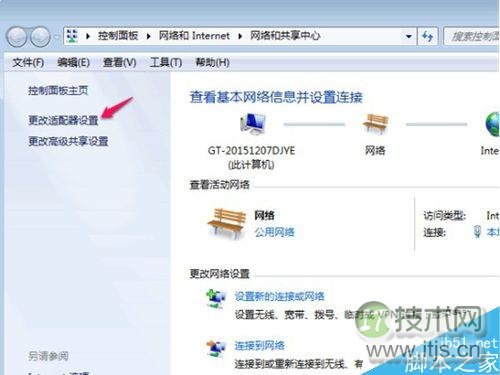 进入"网络和共享中心"后,在窗口左边,可以快速找到"更改适配器设置",点击进入此选项