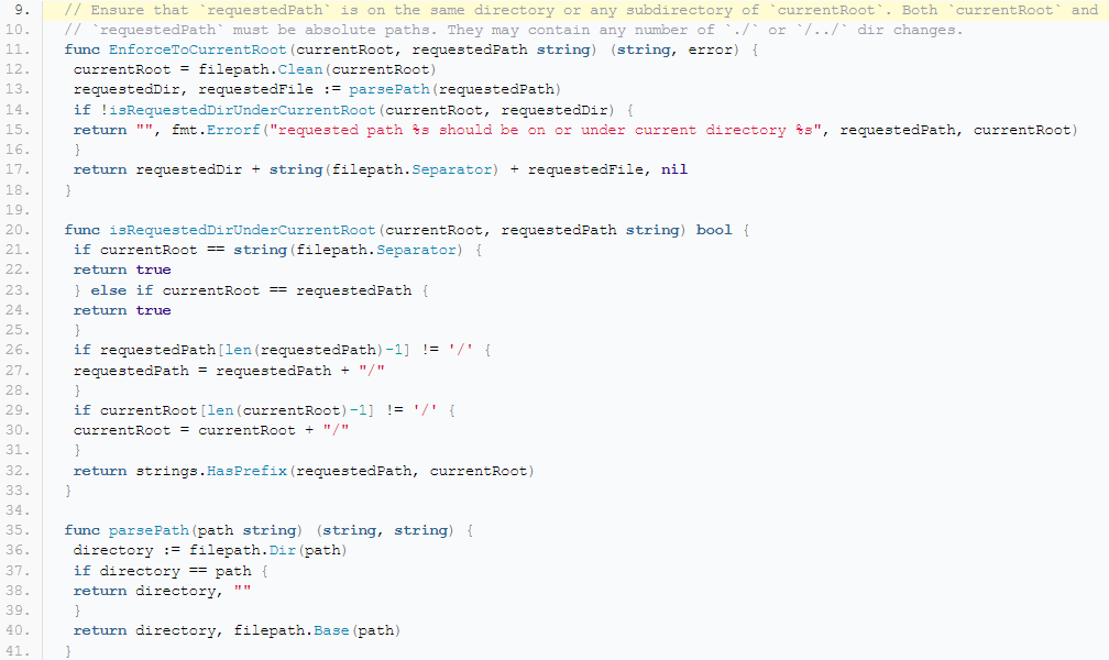 有漏洞的敏感应用中包含许多类型的数据,其中一个包含文件名和其他文件的自包含应用部分的相对路径。文件保存在特定的服务器或名为argocd-reposerver的pod中。由于没有文件等级的强隔离,所以文件路径遍历机制是文件安全的关键。该机制的云服务器内在原理位于util/security/path_traversal.go 中源代码的单个文件。