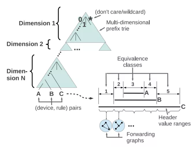 于2013年被提出的VeriFlow[5]是首个的对数据平面进行实时验证的工具。VeriFlow在某种程度上是在Anteater的基础上增加了增量计算,实现实时验证,因为VeriFlow也是基于可达性算法,对数据包进行计算。VeriFlow的大致思想是:实时监控SDN网络中所有的网络更新时事件,VeriFlow处于控制器与网络设备的夹层中;然后VeriFlow旨在受网络更新影响的小范围内进行网络验证,验证过程使用自定义算法。VeriFlow实现只在小范围内进行验证的方法是:通过分析SDN控制器下发的新规则,基于新规则和与新规则有重叠部分的老规则,将网络划分为一组等价类,每次网络更新只会影响一小部分等价类,然后为每个被修改的等价类构建各自的转发图,转发图用于表示网络的转发行为,最后通过遍历转发图来检查网络属性。由于VeriFlow只进行小范围验证,所以验证速度很快,从而基于等价类实现了实时验证的目的。其中等价类的划分是将网络中具有相同转发行为的数据包集合划为一个等价类,为了加速等价类的划分和找到受更新影响的等价类,文中使用多维前缀树(trie)这种适用于包分类算法的数据结构。trie中的每一层对应于转发规则中的特定位,trie的每个节点存在1,0,x三个分支,一个trie可以看作是几个trie或几个维度的组合,每个维度对应数据包头中的一个字段,从trie的根到叶子节点的路径表示与该规则匹配的包集,每个叶子节点存储了匹配数据包集的规则和它们所处的位置,由此完成了等价类的划分,如图3[5]所示。等价类划分后是为每个等价类都生成一个转发图,转发图是用于表示等价类中的数据包是如何被转发的,图中节点表示特定网络设备的等价类,有向边表示对于该(等价类,设备)对的转发规则,若图中两节点X,Y相连表示根据节点X所在设备的转发表,该等价类中的数据包可以发送到Y所在的设备中。构建转发图的过程为了找到与等价类匹配的包和规则,需要再次遍历trie。网络属性的检查是建立在转发图上的,将检查的属性设定为一个验证函数,将转发图作为输入,执行函数,得到结果。VeriFlow开发了一个可编程接口,用于编写和插入新的属性检查函数。在VeriFlow中可达性验证、循环验证、一致性验证等都是通过编写特定函数完成的。