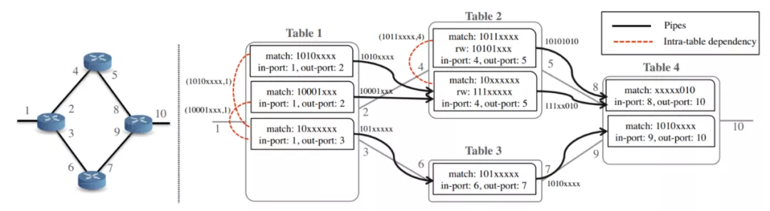 NetPlumber的核心是首先通过各转发表构建了一种依赖图,叫做plumbing graph,如图4[6]所示,然后再通过分析SDN控制器下发的规则对该图进行调整,其中图的节点对应规则,图的有向边称为pipes,对应了规则之间的依赖关系,代表了匹配数据包的可能路径。定义每个pipe边包含一个pipe fliter,用于过滤数据包。文中对规则(节点的定义也是非常巧妙的,定义为一个二元组,match字段用于标识出可以受该规则处理的数据包,action字段表示对这些数据包的操作。在plumbing graph中若两规则节点相连,一是可能这两个规则所属的网络设备之间存在物理链路,二是可能被第一个规则节点处理后的数据包能够被第二个规则节点识别并再进行处理。对于规则的增加、删除和链路的增加、删除文中都介绍了如何对plumbing graph进行更新,该内容也是NetPlumber能够进行实时验证的基础,每一次网络发生变化时,不会重新建立plumbing graph,而只是小范围的更新,计算速度较快,以实现实时更新。文中提到的还有助于实时网络更新的一个思想是分布式NetPlumber,将plumbing graph分成多个集群,一个集群内的节点交互更多,集群间的共用节点复制出一个划入另一个集群,然后各集群之间可以同时计算,速度更快。