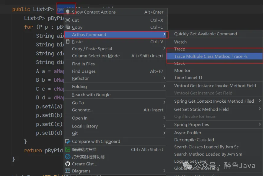 test 方法名位置,右键选择 Arthas Command 中的 Trace 或者 Trace Multiple Class Method Trace -E 命令进行复制。