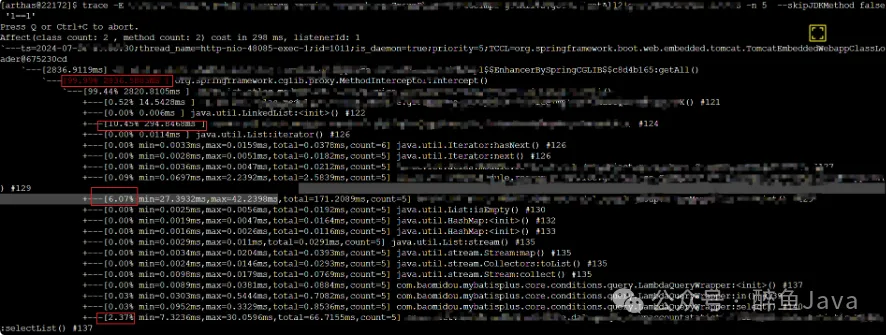 将该命令粘贴到 Arthas 的终端之后,发起对该接口的请求,即可看到每一行代码花费的时间,此处我拿一个其他接口来做示例,参考如下: