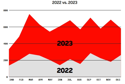 专门的数据泄露网站显示,被暴露的受害者数量比2022年增加了76%,这使得2023年的受害者总数达到4615人。新出现的大型游戏狩猎(Big Game Hunting,BGH)玩家是受害者数量猛增的因素之一。