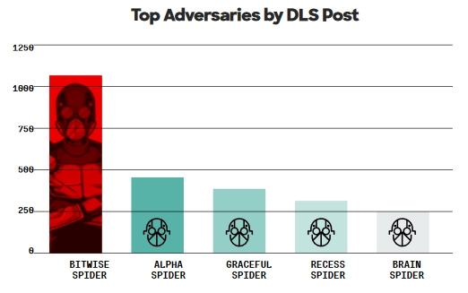 总的来说,BITWISE SPIDER、ALPHA SPIDER、GRACEFUL SPIDER、RECESS SPIDER和BRAIN SPIDER是攻击主力军,所披露受害者占总数的77%。其中,BITWISE SPIDER和ALPHA SPIDER历来都名列前茅,分别在2022年和2023年位居DLS披露受害者最多的第一名和第二名。