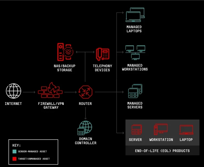 企业网络中的某些设备不一定受到安全解决方案的监视。特别是,边缘网关设备通常基于过时的架构,因此容易受到攻击者可能利用的多个漏洞的攻击。例如,防火墙和VPN平台的漏洞在2023年被用来袭击了思科、思杰和F5,路由器、移动电话或NAS/备份存储也可能受到攻击。