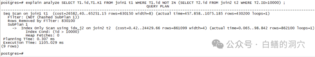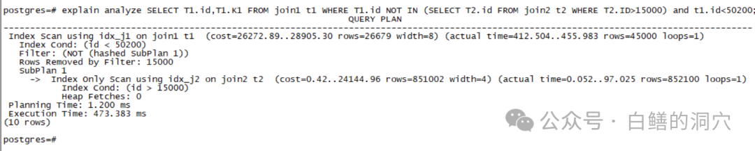PG 14则还是使用祖传的Filter: (NOT (hashed SubPlan 1))算子,执行时间的差距拉得更大了。