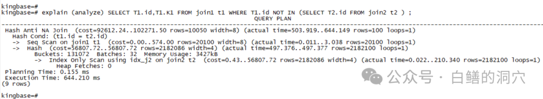 我们再来看一下KES V9,它使用了Hash Anti LSNA Jion算子,效率也高了不少。Oracle、SQL SERVER等数据库都支持Hash Anti Jion算子,这对于NOT IN等类型的SQL消除子查询是十分有效的,特别对于数据量很大的情况。KES在算子方面从O记借鉴了很多,对于HASH ANTI JOIN,设计了NA ,LSNA,RSNA等多种算子,分别针对不同的场景。