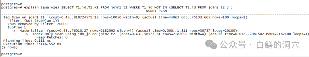 首先我们在一套PG 14上测试一下下面的一个带有NOT IN子查询的SQL: