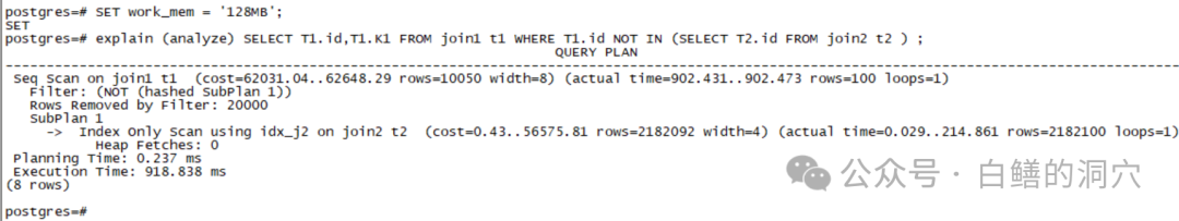 当然我们也可以通过设置更大的WORK_MEM来优化这条SQL,上面是我们把WORK_MEM加大到64M后的执行效果。不过能够在不需要调整WORK_MEM的情况下,通过优化器去解决这些问题,是不是对用户更加友好呢?而实际生产环境中,很多情况下,子查询的结果集可能会更大,我们也不能总是通过加大WORK_MEM来解决问题吧。