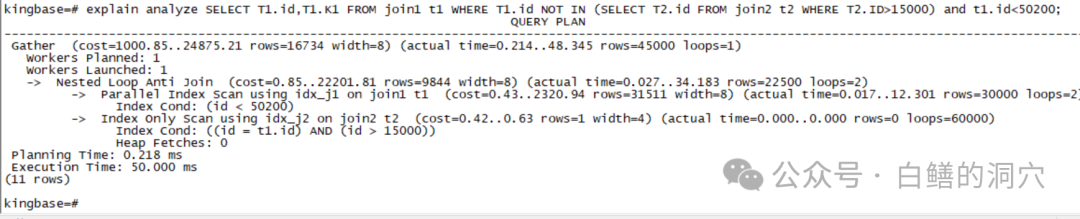 对于此类查询,Hash Anti Jion算子并不一定是最优的选择,如果子查询能够等价转换为JOIN,那么在不同的情况下,可能需要使用其他的算子来解决问题。修改一下查询条件,让外表扫描返回的数据量更少,在这个案例里KES V9优化器认为走Nested Loop Anti Jion最佳,看上图的结果,确实如此,执行时间降低到50毫秒。除此之外,适当调整数据量,我们还能看到这条SQL使用了MERGE ANTI JOIN算子,这些算子都是KES为了提升此类表连接的性能自研的。